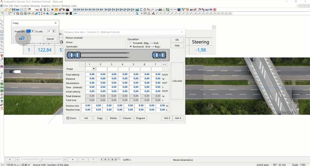 Our primary goal is to determine the collision speed of the two vehicles. Analyzer offers several methods for this, with momentum forward calculation being one of the most commonly used techniques. In this case, we are conducting an automatic collision analysis which relies on the same principles but speeds up the trial-and-error part drastically.