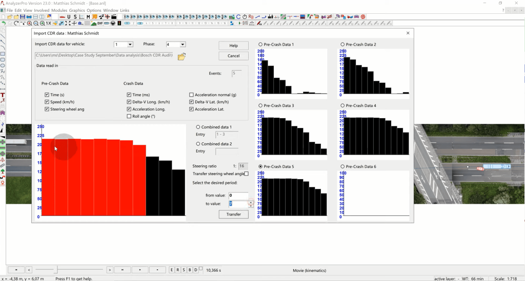 (1) Data Import: Within Analyzer, a dedicated module for Bosch CDR data is accessible via the “Modules” section, under “Import driving data.” We select the appropriate file format (e.g., CSV) and specify that this data pertains to vehicle 2.