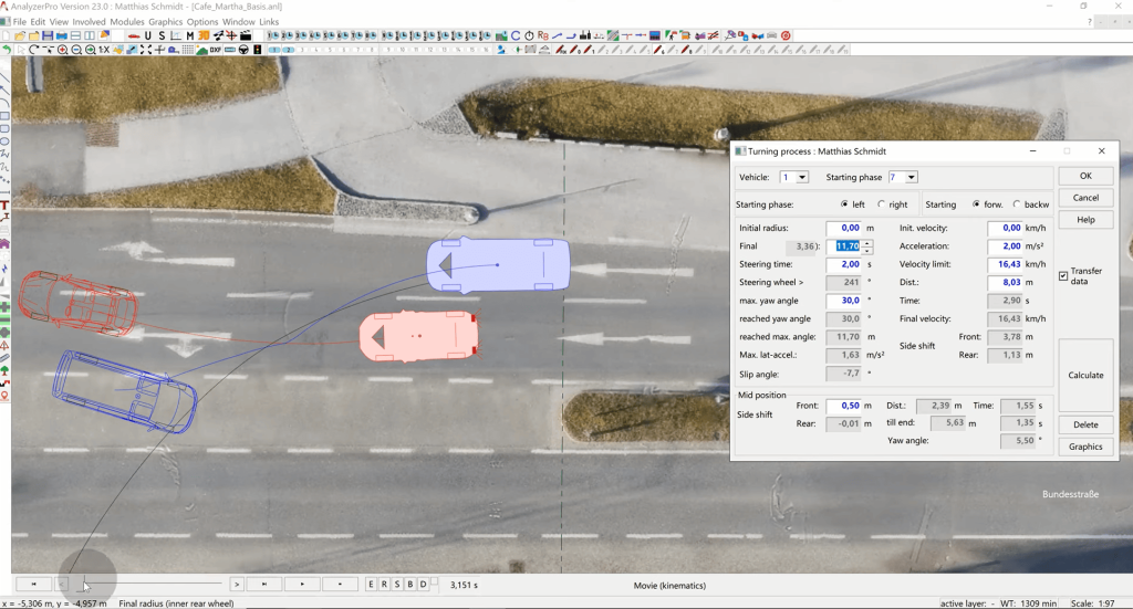 After our initial steps, we proceed with a Pre-Collision Analysis to gain a deeper understanding of why and how the accident occurred. To do this, we’ll use a specialized module for our blue car called the Turning Procedure Module, designed to simulate vehicles going around curves, allowing for acceleration during turns and more.