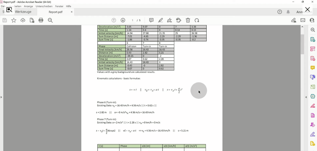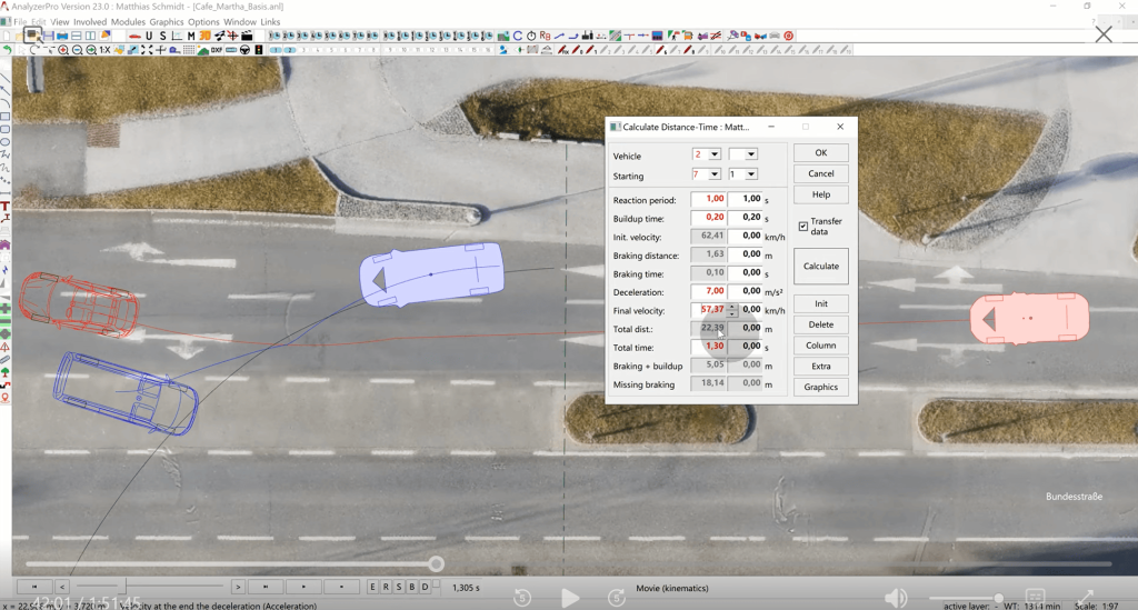Total Time: We check when the blue car is likely to be visible for the red one. This could be when the left front edge of the blue car is moving on to the lane of the red car. Using the time bar, it can be found out that this was approximately 1,3 seconds before impact. That means that the total time, aka the time available for reaction, build up and braking results in 1,3 seconds.