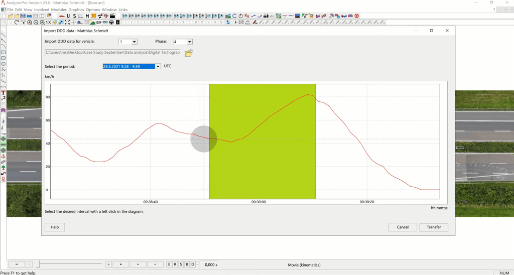 (1) Data Import: The process begins by navigating to the “Modules” section, selecting “Import driving data,” and then choosing “DDD tachograph data.” The relevant DDD file is loaded, and we proceed to select the specific time period corresponding to the collision, which is the final recorded data point before the accident.