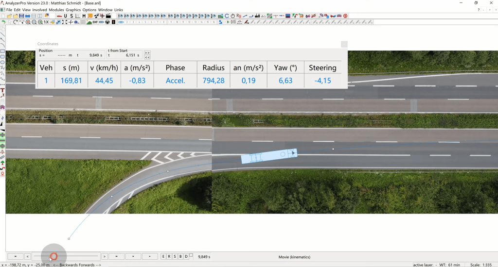 (4) Validation: To confirm the feasibility of our interpretation from a physics standpoint, we refer to the Coordinates Window. This window provides detailed information about every point in the truck’s movement. We assess whether the lateral acceleration falls within acceptable limits, verifying the technical viability of the reconstructed scenario.