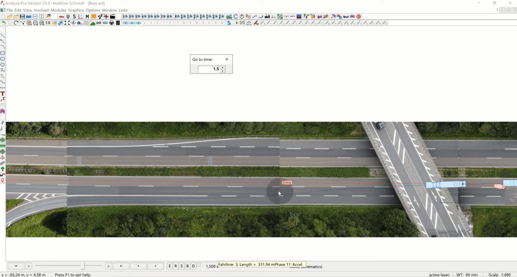 Once these values are entered, we click “Calculate.” The software then computes missing values and displays the driving path of the blue car. An advantageous feature of Analyzer is its ability to adjust other values based on changes made, facilitating scenario exploration.