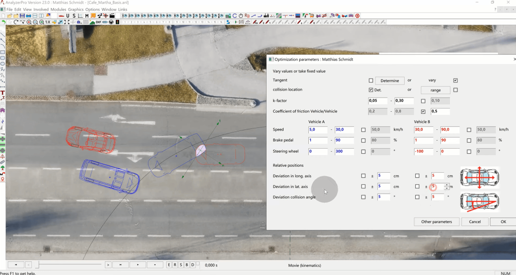 In the bottom of the window, we can indicate that we do not have the exact positions of our collision. This is why we give the two cars relative shifts and rotations to their indicated positions: we specify a range or 5 cm and 5 degrees.