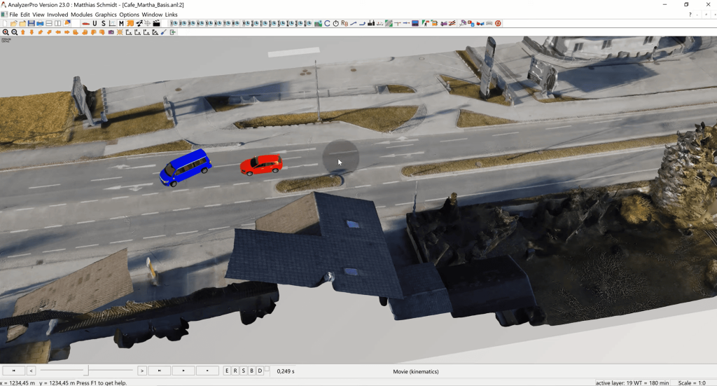 Examination of the kinematic data of the red car shows a phase of acceleration followed by deceleration. The beginning of the reaction occurs when the red car changes from acceleration to deceleration, about 1.5 seconds before point 0, which is the collision position. If we click on the clock symbol and enter 1.5, we see the scenery exactly 1.5 seconds before the collision. In our case, we can conclude that the red driver should have seen the blue truck earlier, which means that he could have reacted earlier.